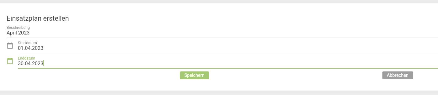 Ein Einsatzplan wird mit der Funktion "Einsatzplan erstellen" generiert. Am Einsatzplan kann eine Beschreibung, ein Von- und Bis-Datum angegeben werden: