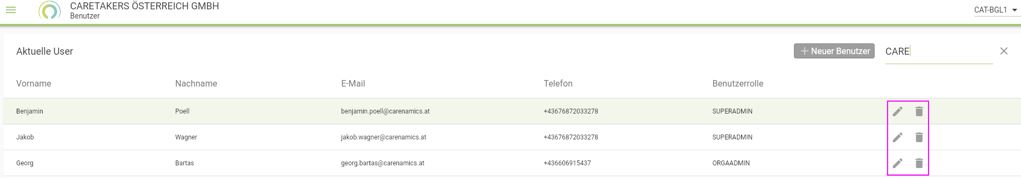 Über das Menü im rechten Bereich können neue Benutzer angelegt werden. Bestehende Benutzer können am Ende der Zeile bearbeitet bzw. gelöscht werden:
